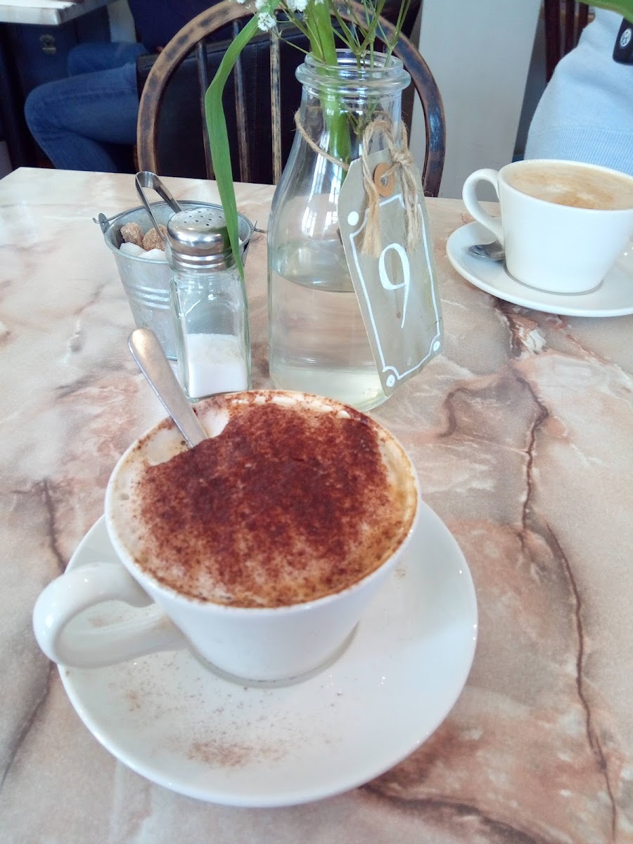 Lovely cafe, £8 for regular cappuccino and a excellent slice of cake. The breakfasts I saw going out also looked great.